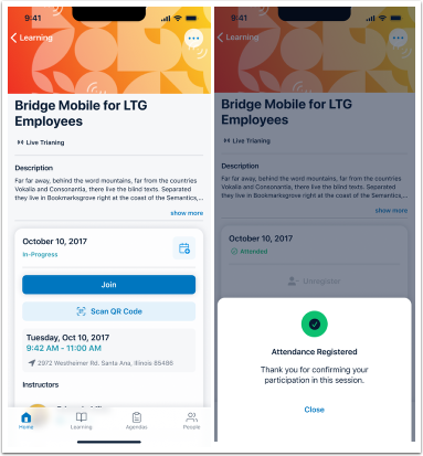 Learners and Instructors can now instantly mark attendance for a live training session by scanning a QR code using the mobile app. This capability is exclusive to the mobile experience, making on-site registration quick and easy.